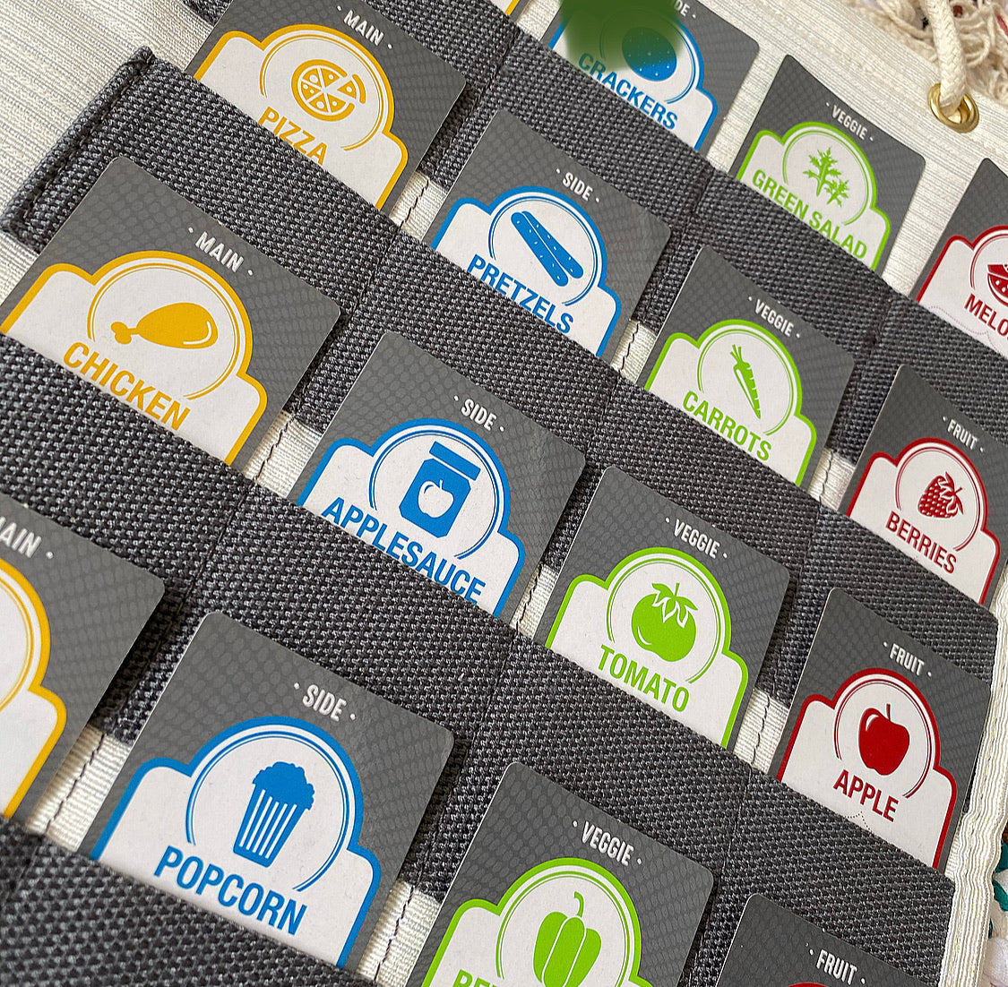 Starter pack includes 15 mains, 7 sides, 12 veggies, 11 fruits, and 5 sweets. Each laminated meal card includes 3 variations and space for customization.